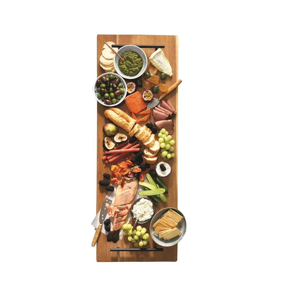 Create a grazing platter that’s the talk of the whole party with the Alex Liddy Long Serving Board. This serving essential boasts an impressive length of 1 metre and is a must have for hosting great seasonal parties. The Alex Liddy Long Serving Board is also fitted with 2 carry handles for easy transportation and is ideal for crafting an impressive array of cheese and charcuterie that your guests will love. Crafted from premium quality acacia wood, the Alex Liddy Long Serving Board showcases a stunning natural grain and colour contrasted against the darker metal handles that gives your table a chic, rustic appeal. Use the Alex Liddy Long Serving Board as your table’s centrepiece or take it out for a fun picnic in the warmer months. Packaged for gifting, the Alex Liddy Long Serving Board is a wonderful gift idea for birthdays, weddings, anniversaries and more.