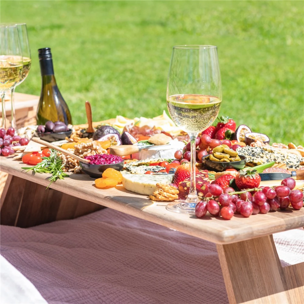 Soak up the sun with a bottle of wine, your closest friends and a grazing platter served on the Alex Liddy Acacia Picnic Table. This stylish and convenient serving accessory is crafted from naturally sturdy acacia wood, making it a better alternative to harmful and flimsy plastics or heavy, clunky picnic gear. Lightweight and durable, the Alex Liddy Acacia Picnic Table is the perfect serving piece. With its extra-large size, the Alex Liddy Acacia Picnic Table is perfect for serving up bowls and plates of dip, cheeses, fruits, pickles and other bite-sized appetisers, plus it can securely hold a standard size wine bottle! Sturdy legs keep it secure while in use and fold flat for compact storage, making it easier to transport than standard alternatives. Easy to clean, the Alex Liddy Acacia Picnic Table can simply be washed by hand. Packaged for gifting, the Alex Liddy Acacia Picnic Table is an excellent gift for weddings, birthdays, and other events.