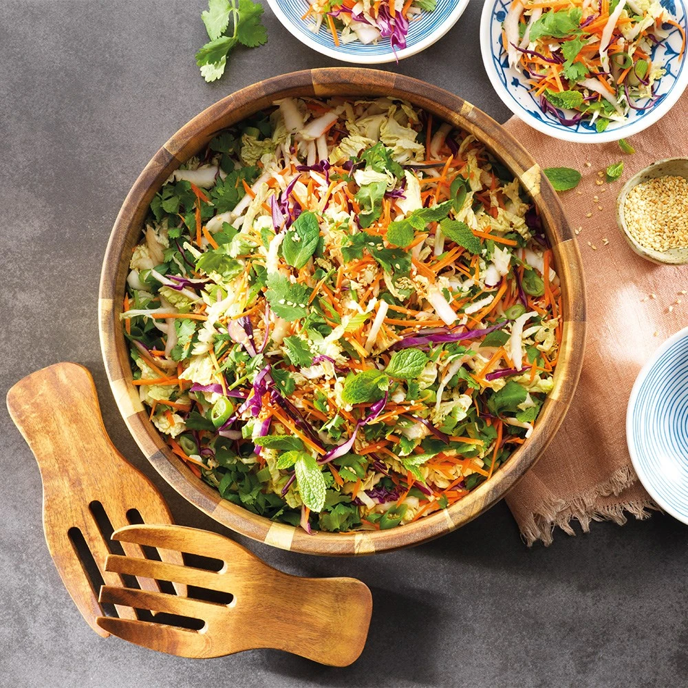 Make any salad or side dish appealing for your guests by serving them up in the Alex Liddy Acacia Round Salad Bowl with Servers