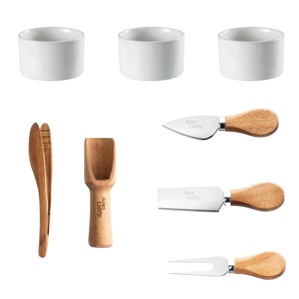 Enjoy a great tasting cheese board with friends with the Alex Liddy Acacia Tray 9 Piece Serving Set!