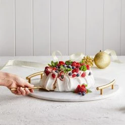 Set a stunning and inviting table for your friends, family and guests to enjoy a selection of delicious treats with the Alex Liddy Slate & Co Round Marble Serving Board. This beautiful serving piece is crafted from the finest quality white marble and features contrasting black veins that add a touch of modern sophistication to any table setting. Fitted with gold plated handles, the Alex Liddy Slate & Co Round Marble Serving Board is easy to transport from kitchen to table, ensuring mess and hassle is minimised completely. With its large, generous surface size, the Alex Liddy Slate & Co Round Marble Serving Board is suitable for serving a wide assortment of appetisers, such as tapas, slices, cheese and more. For an added serving tip, chill your Alex Liddy Slate & Co Round Marble Serving Board in the fridge prior to serving fruits and other cold desserts to ensure they stay chilled for longer while on your table. Easy to clean, the Alex Liddy Slate & Co Round Marble Serving Board is hand wash only.