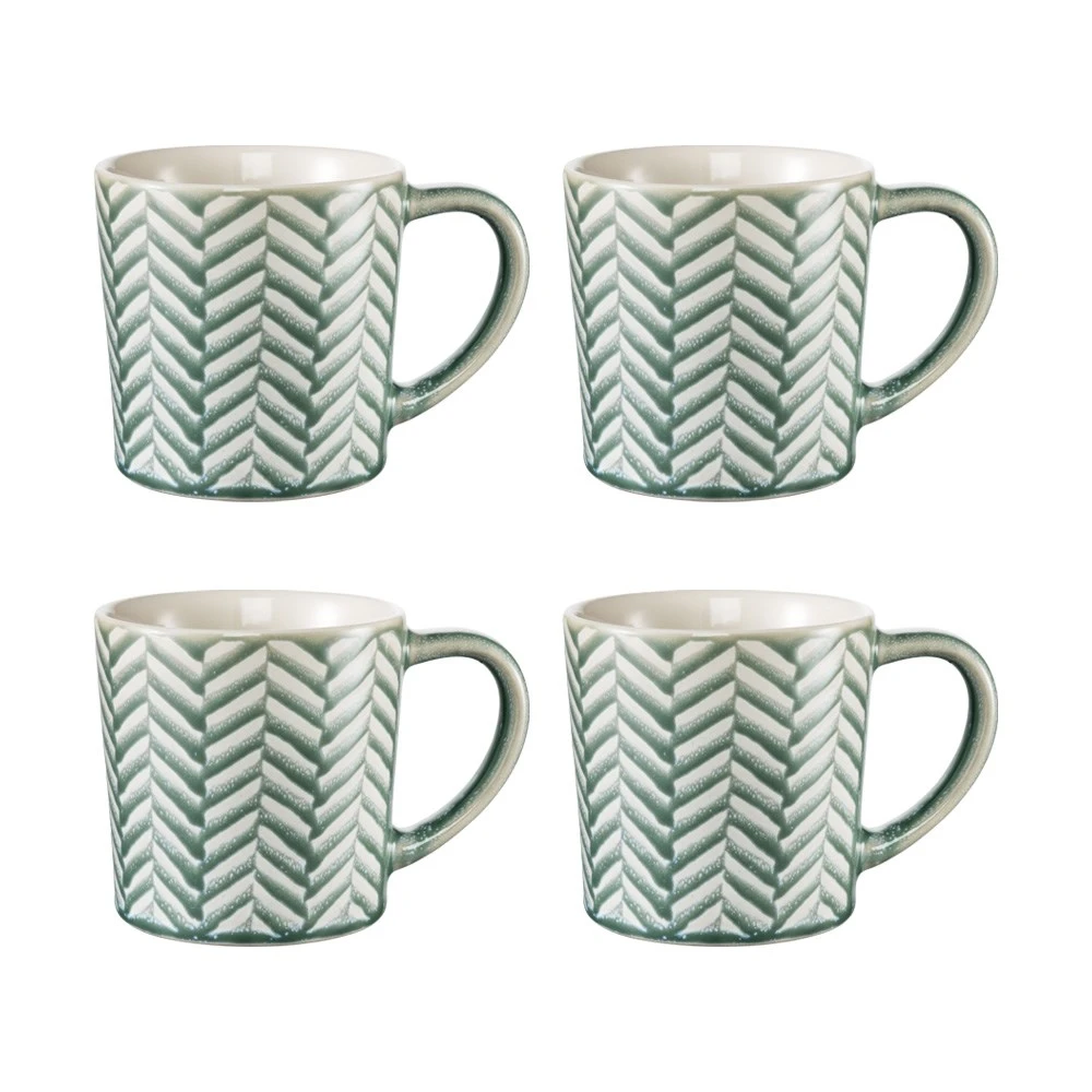 Replace old, mismatched, chipped mugs with the beautifully coordinating Quad Set of 4 Mugs 410ml Chevron from Ambrosia. With a premium stoneware construction, the Ambrosia Quad Set of 4 Mugs 410ml Chevron is guaranteed to be a part of your collection for many seasons with their excellent durability and long-lasting resilience. Boasting classic shapes with large ergonomic handles that maximise grip and comfort, these generous 410ml capacity mugs make fantastic vessels for curling up with your favourite strong coffee, aromatic tea or rich cocoa. With an eye-catching hand-painted style chevron design in a shade of soft khaki green, each mug is completed with a reactive glaze for a stunning artisan aesthetic. Offering microwave and dishwasher-friendly properties, the Ambrosia Quad Set of 4 Mugs 410ml Chevron makes a stylish and convenient addition to your kitchen.