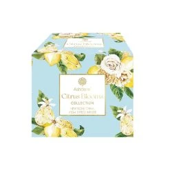 - Features bright citrus fruit and florals atop a soft, coastal blue background
