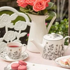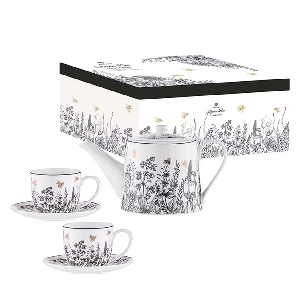 Catch up with a friend over freshly steeped tea served with the Ashdene Queen Bee Teapot & 2 Teacup Set. Overflowing with rustic elegance, the Ashdene Queen Bee Teapot & 2 Teacup Set displays intricate fine-point illustrations of wildflowers in a rich black tone that pops out from the fresh white backdrop. Refined style paired with premium durability is brought to the tabletop thanks to their quality new bone china constructions. Graced with metallic gold honeybees at enchanting intervals, it’s hard to beat the unique design and luxury aesthetic of this set. For a beautifully curated tea party, pair the Ashdene Queen Bee Teapot & 2 Teacup Set with more equally impressive pieces from the Queen Bee line.