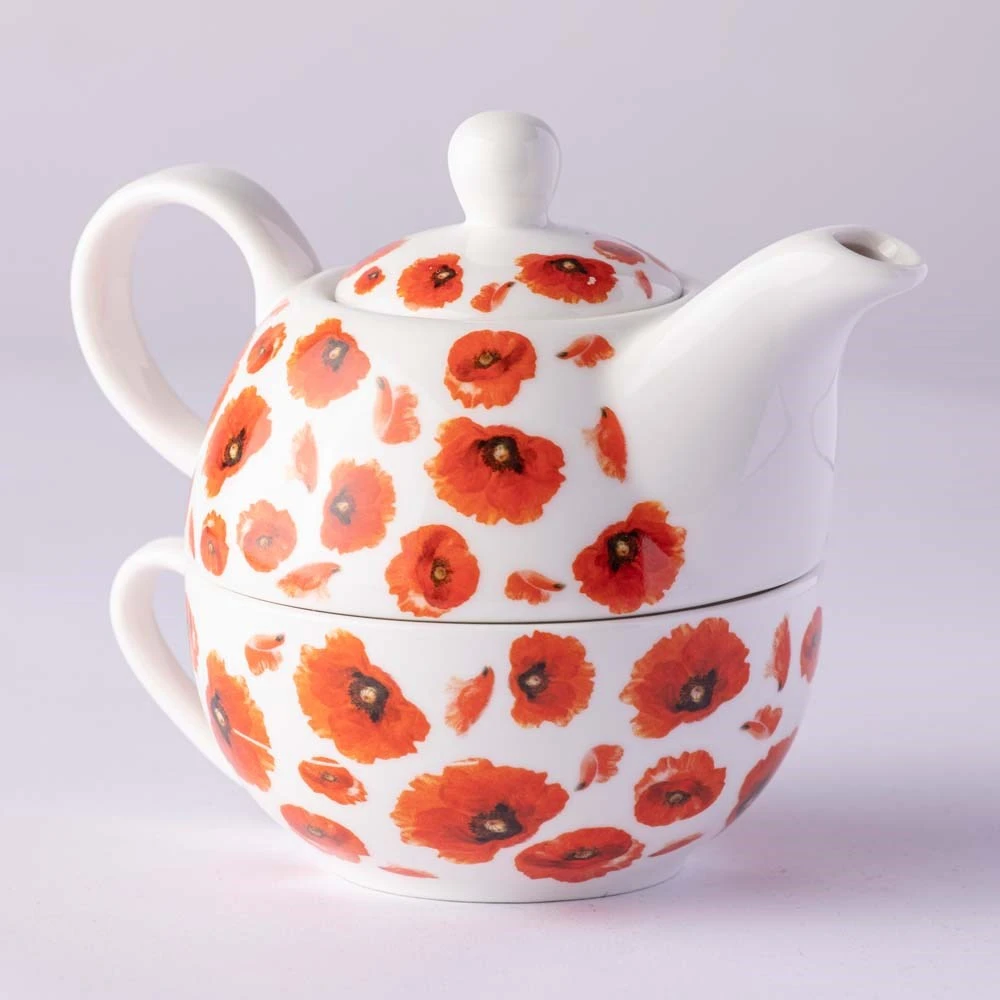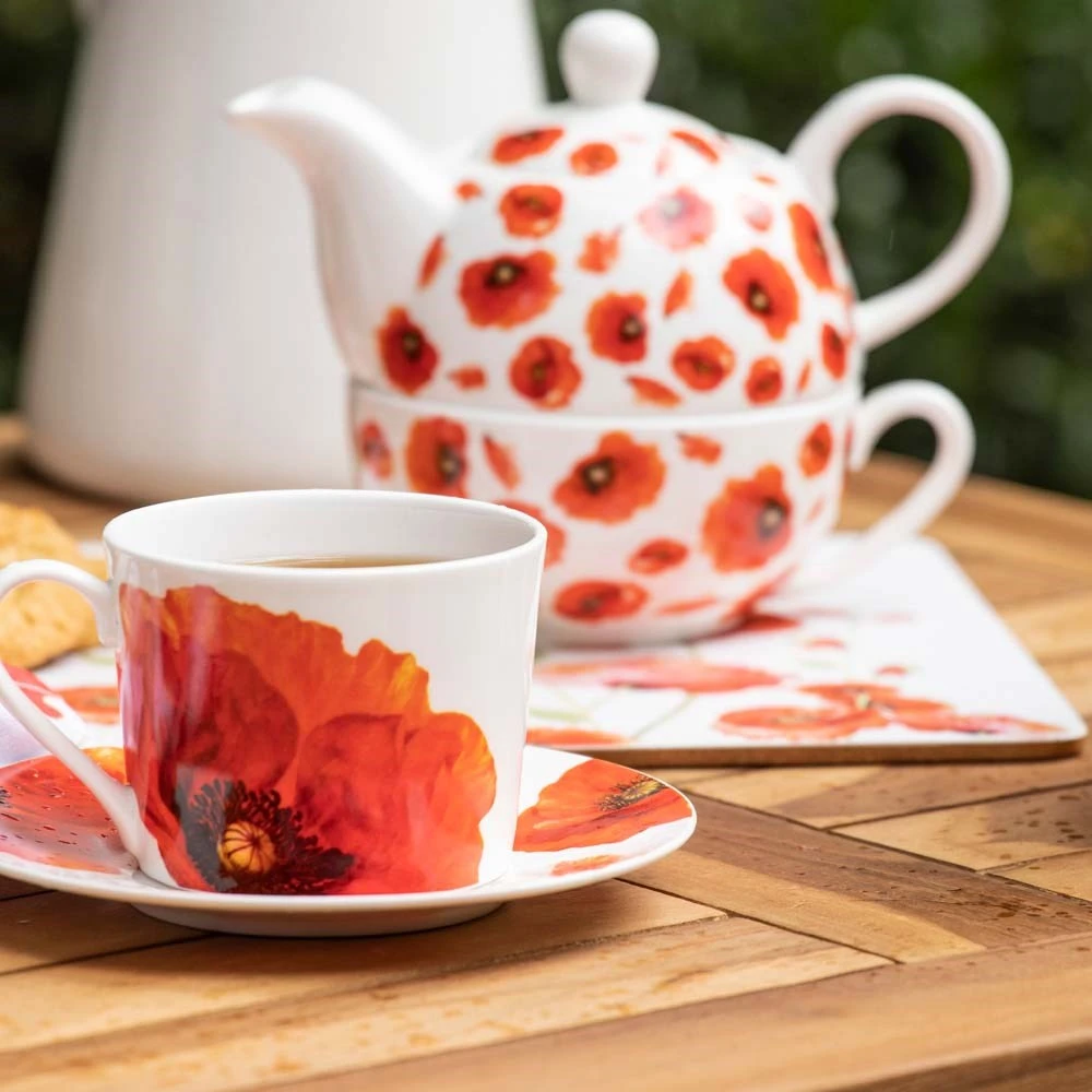 The Ashdene Red Poppies Tea for One features stunning poppy illustrations by leading botanical artist Jenny Phillip
