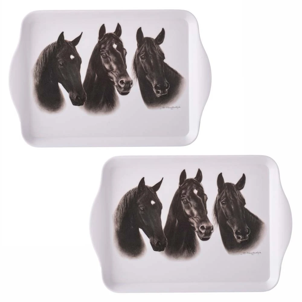 Bring an elegant touch to afternoon tea with a selection of cakes and sweet treats served atop the Ashdene Trio Set of 2 Scatter Trays Black. Decorated with magnificent artwork by Danguole Serstinskaja, a master drybrush painter from Lithuania, the Ashdene Trio Set of 2 Scatter Trays Black inspires your tabletop with its breathtaking beauty. On a clean white background, three regal black horses are rendered in hyper-realistic greyscale. Crafted from highly resilient, dishwasher-safe melamine, the trays will adorn your tabletop with their beauty and practicality for years to come. Complement the Ashdene Trio Set of 2 Scatter Trays Black with matching pieces from the exquisite Trio collection.
