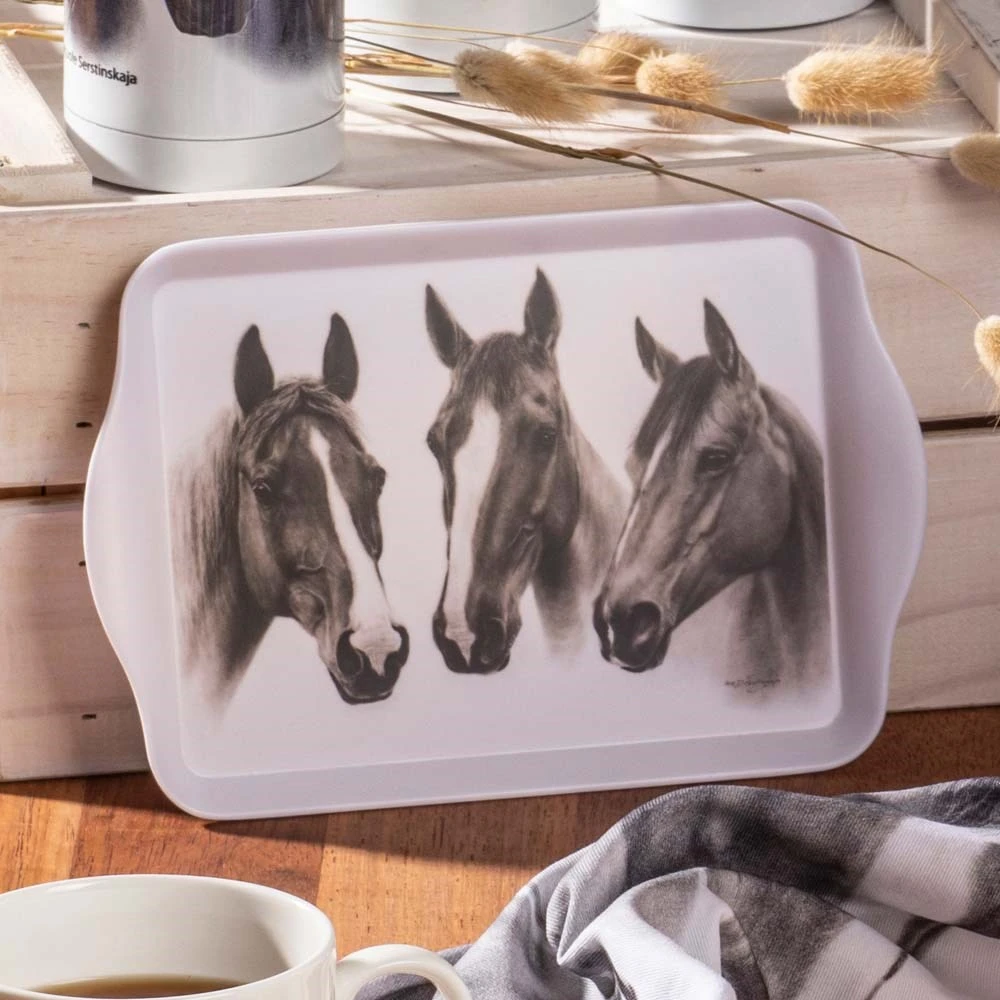Bring an elegant touch to afternoon tea with a selection of cakes and sweet treats served atop the Ashdene Trio Set of 2 Scatter Trays Chestnut. Decorated with magnificent artwork by Danguole Serstinskaja, a master drybrush painter from Lithuania, the Ashdene Trio Set of 2 Scatter Trays Chestnut inspires your tabletop with its breathtaking beauty. On a clean white background, three regal chestnut horses are rendered in hyper-realistic greyscale. Crafted from highly resilient, dishwasher-safe melamine, the trays will adorn your tabletop with their beauty and practicality for years to come. Complement the Ashdene Trio Set of 2 Scatter Trays Chestnut with matching pieces from the exquisite Trio collection.