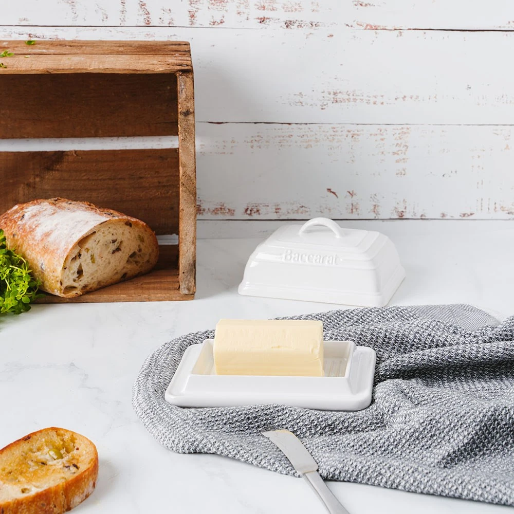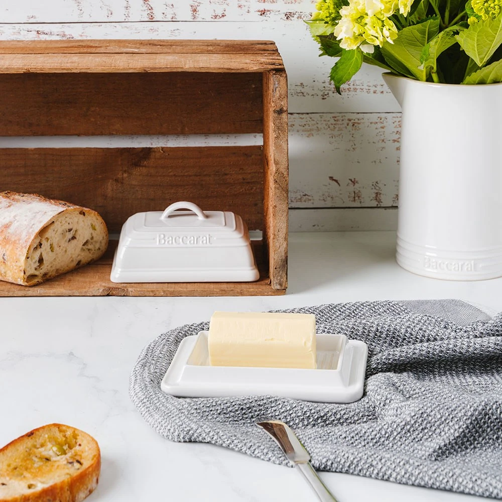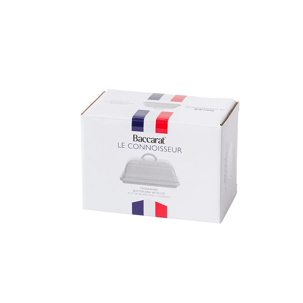 Enhance any French inspired dish with the Baccarat Le Connoisseur Stoneware Butter Dish 16cm White. Essential to many European cuisines, the butter dish is a reliable companion for crafting sauces, pastries and more. Keep your butter soft and fresh for easy spreading, with a finely crafted stoneware enclosure that endures everyday use. While certainly at home in the kitchen, the Baccarat Le Connoisseur Stoneware Butter Dish is also suited to the table. Accompany your scones, sourdough, ciabatta, or naan with rich, creamy butter. Clean and timeless, its white finish blends seamlessly into any table setting. Evoking French history with a tricolor inspired design, the Baccarat Le Connoisseur Stoneware Butter Dish is dishwasher safe for your ease and convenience.