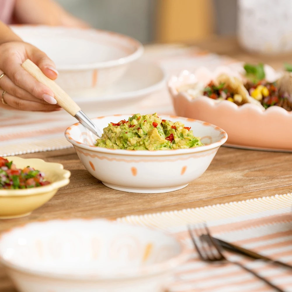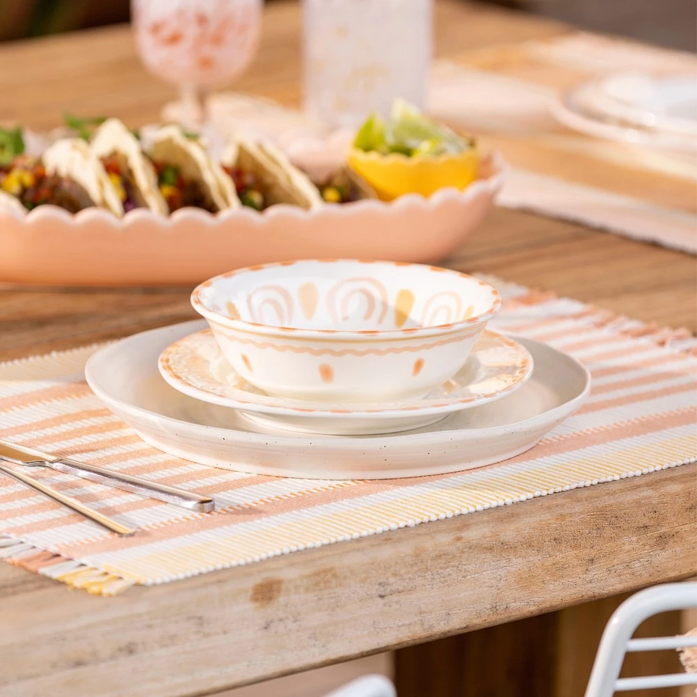 Lay your table with the essence of summer in the form of the beautiful Ecology Arizona Cereal Bowl 17cm. Designed in Australia by Heather Piez with inspiration from dry desert days and warm evenings, the Ecology Arizona Cereal Bowl 17cm uses radiant yellow and orange hues to represent the powerful heat of the sun. Crafted from quality stoneware, this resilient cereal bowl offers a classic body and mildly organic silhouette with tactile features that add texture to the table setting. The refreshing, light, creamy background is adorned with colourful arched motifs that mimic the movement of the ever-rising and setting sun to provide the perfect backdrop for enjoying delicious breakfasts as well as salads and other sides. Pair the stunning Ecology Arizona Cereal Bowl 17cm with other tableware items from the Arizona range to create a flawless summer alfresco dining atmosphere.