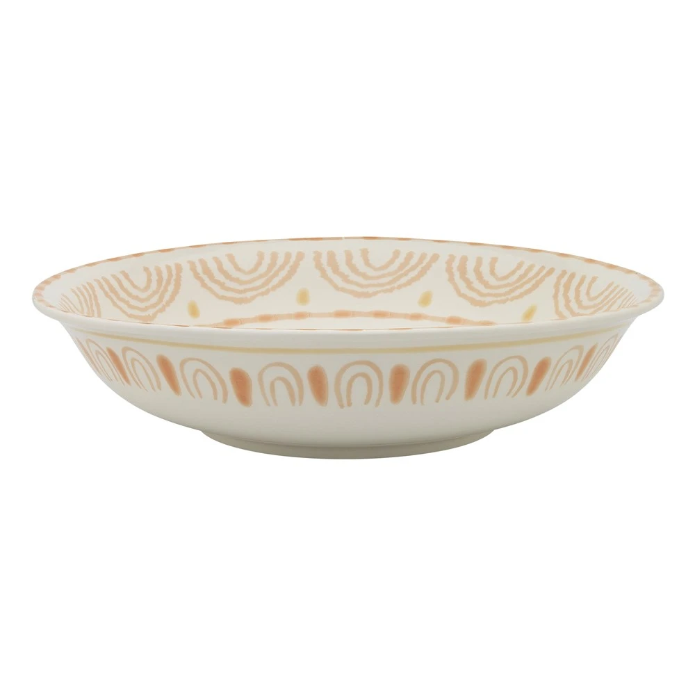 Lay your table with the essence of summer in the form of the beautiful Ecology Arizona Shallow Serving Bowl. Designed in Australia by Heather Piez with inspiration from dry desert days and warm evenings, the Ecology Arizona Shallow Serving Bowl uses radiant yellow and orange hues to represent the powerful heat of the sun. Crafted from quality stoneware, this resilient serving bowl offers a classic body and mildly organic silhouette with tactile features that add texture to the table setting. The refreshing, light, creamy background is adorned with colourful arched motifs that mimic the movement of the ever-rising and setting sun to provide the perfect backdrop for serving fresh salads, fragrant rice, grilled vegetables and other sides. Pair the stunning Ecology Arizona Shallow Serving Bowl with other tableware items from the Arizona range to create a flawless summer alfresco dining atmosphere.