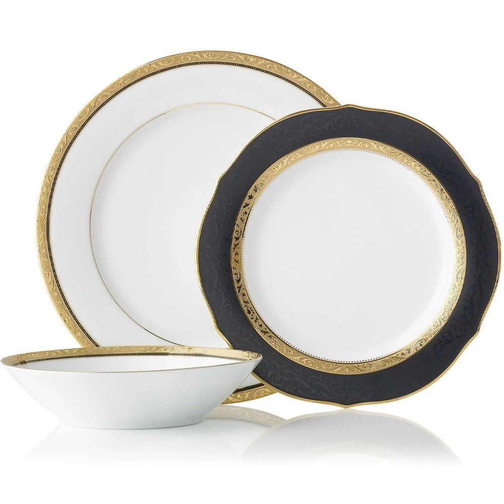 The elegant and luminous Regent Gold features a richly embossed 24K gold band contrasted against a fine black line, all on a crisp white porcelain body. The set also contains a stunning 23cm ‘scallop’ shaped embossed black accent plate which really brings a ‘wow’ factor to the table. Designed in Japan, Regent Gold is stylish and sophisticated. It is chip resistant and dishwasher safe. Noritake has been a bastion of ceramic artistry and craftsmanship around the world since 1902, after growing out of the Morimura Brothers trading company in New York City. Each piece is imbued with the same spirit and thoughtfulness of the first Noritake factory, established near Nagoya on the Japanese mainland.