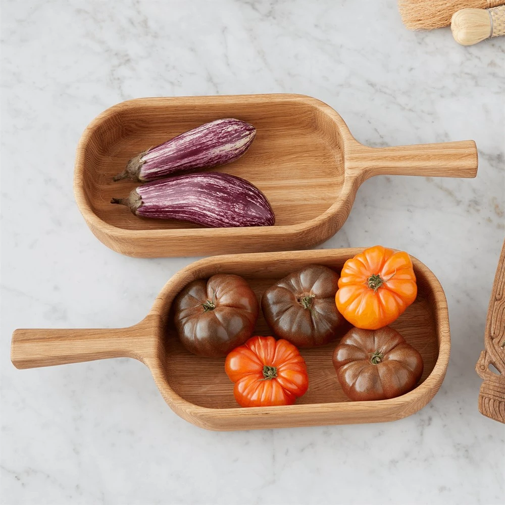 Add a stylish touch to your kitchen counter or dining table with the minimalist Royal Doulton Olio Oak Serving Board 41cm, an inspired blend of artisan and contemporary design. With a humble outline, reminiscent of earlier times, this serving board boasts timeless appeal that will hold its own while standing strong through inevitable changes in dining trends. Crafted from stunning oak wood, the board has deep sides that are ideal for containing and serving fresh crusty bread, tasty seasonal salads and other delicious sides, while its prominent handle offers both convenient transportation and a bold style aesthetic. Functional for everyday use and sleek enough for special occasions too, mix and match the Royal Doulton Olio Oak Serving Board 41cm with other items from the stylish Olio range to curate your dream tableware collection.