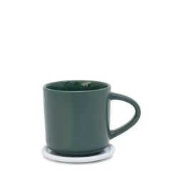 - Botanical green mug with a contrasting clean white coaster