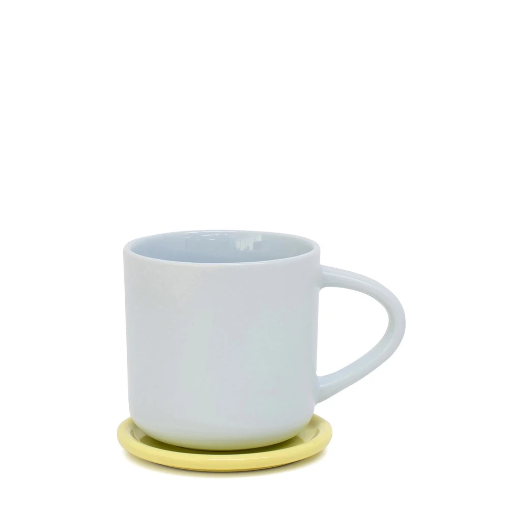 - Soft, sky-blue mug with a contrasting bright yellow coaster
